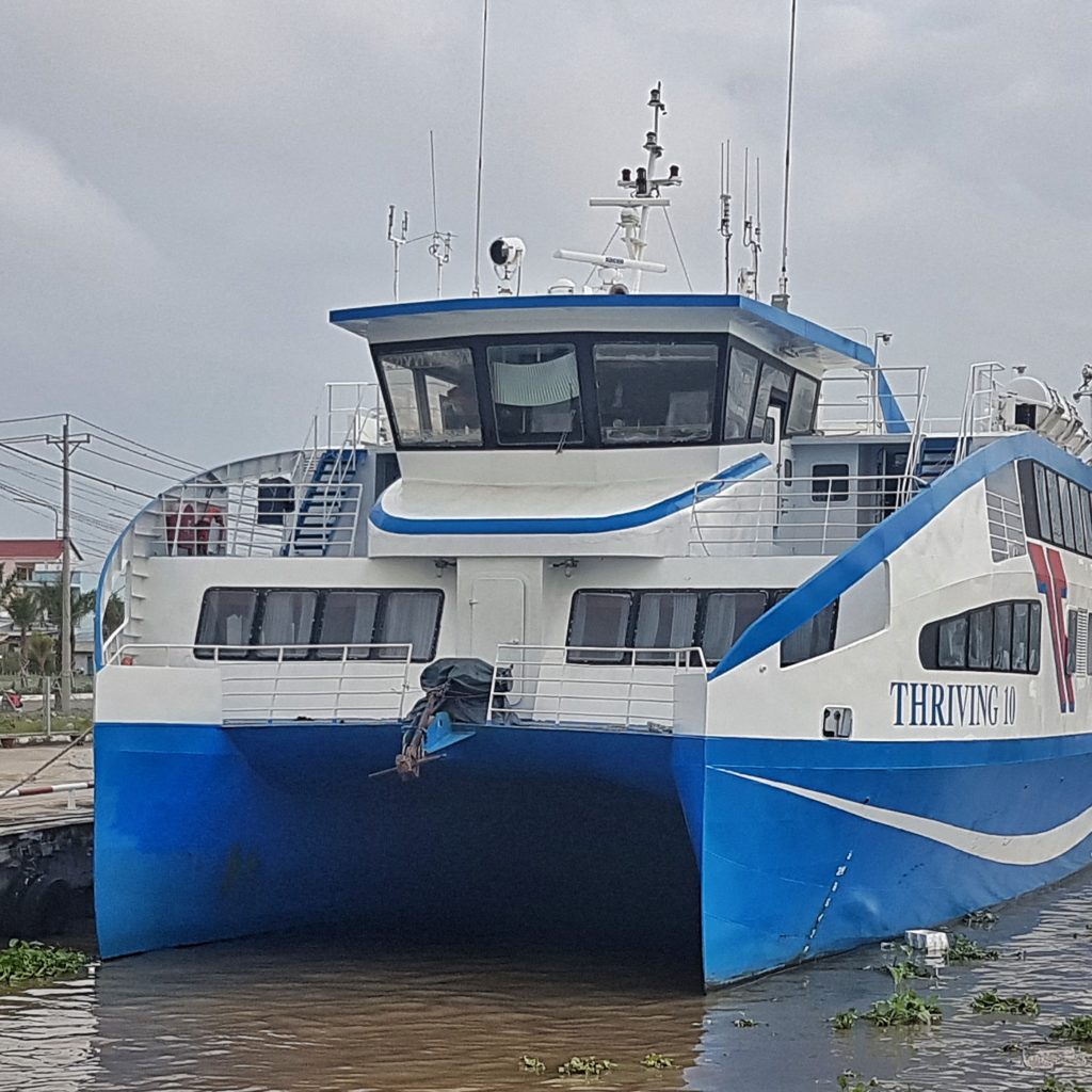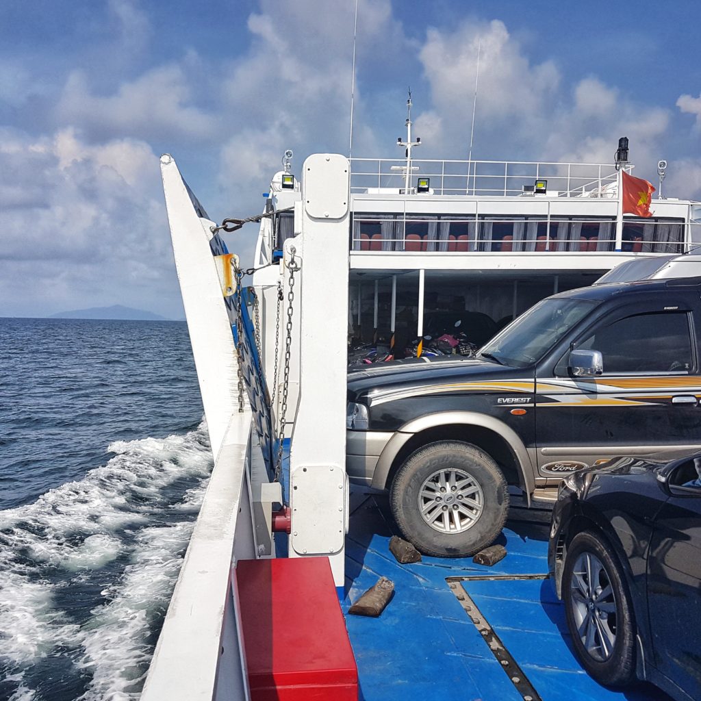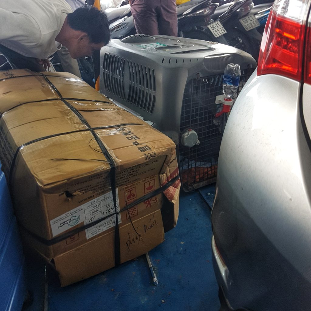 We managed to successfully get the cage and dog on board. We had tickets that gave us access to the air conditioned seated area, but the dog (Kiara) needed to stay in the cage and in the car/motorbike parking area. The total journey is around 3 hours depending on the wind. Vietnamese people are very curious if you travel with a dog and some are scared, so take care and keep your dog away from other people unless asked. I took Kiara out a few times but stayed near her cage so she could stretch her legs a bit.