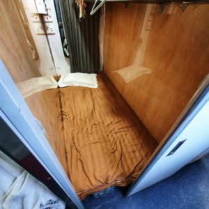 When we arrived at the train station at 17.00 on March 5, we met with our contact at the train station. For some extra money he would assist us to bring the dog on board. He asked to put the crate at the special cargo area. We waited until 6pm when he told me to go in and wait with suitcases and meet him at the train in wagon #5. After another hour of waiting the gates opened and I was pointed to a staff cabin in wagon #5. It was literally a thin mattress on some wood supported by water jugs. Kiara’s cage was inside the door way in between two wagons (really loud noises). 30 minutes after we left our train contact guy told me I could take Kiara to my cabin and out of the cage (he had closed all other cabin doors). I asked (via my Vietnamese friend) to see if we could stay in a proper cabin, which was only possible the next day at 6am. So we stayed 1 night in the staff cabin and the next day we moved to a guest cabin which was empty.