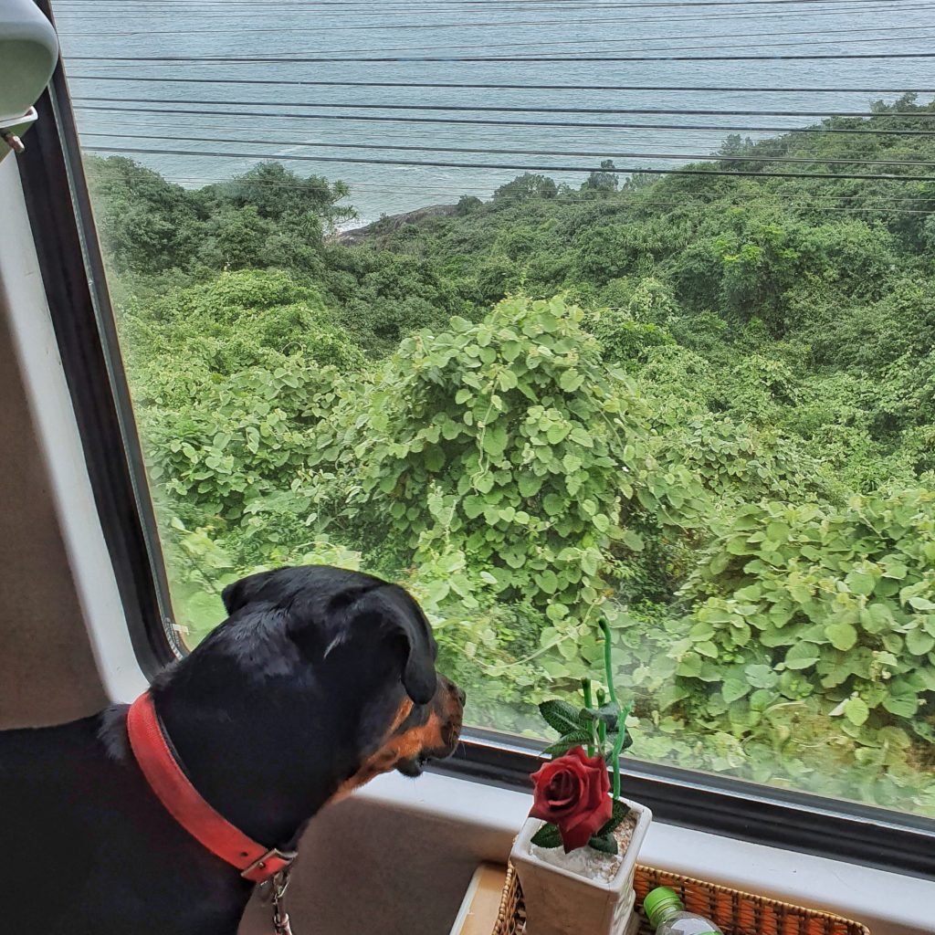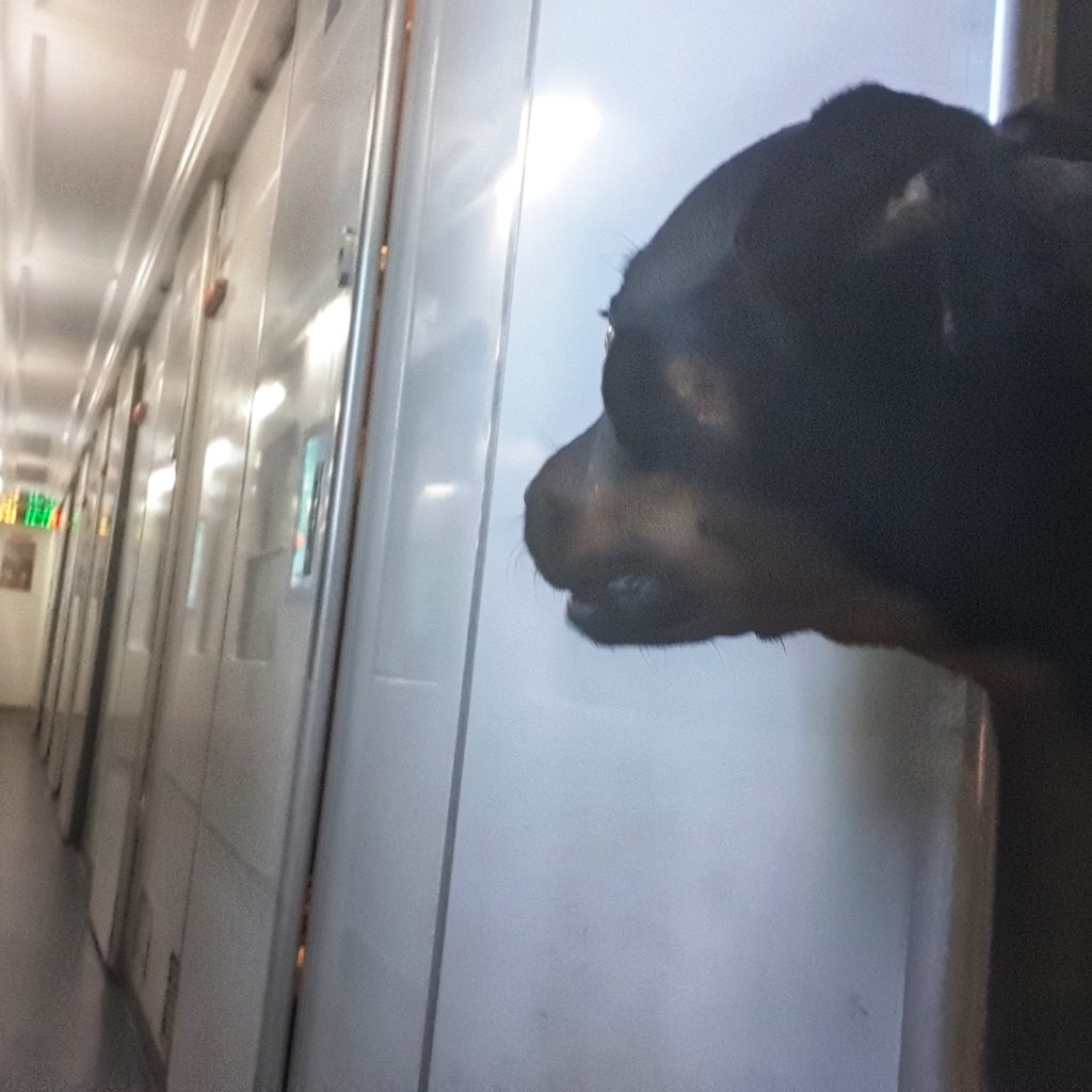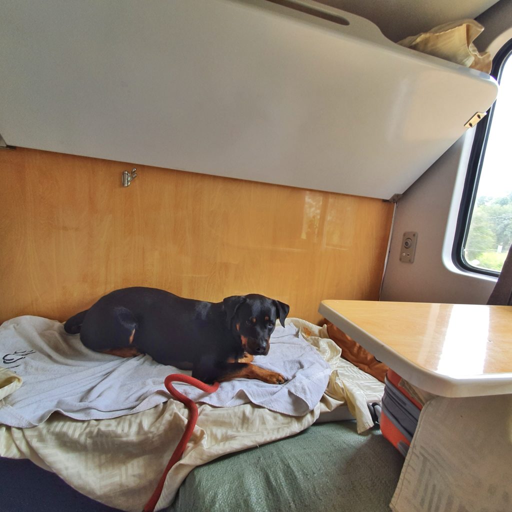 The journey when we were in the guest cabin was amazing. Kiara and I enjoyed some good views. We had stocked up some food and had a bunch of movies and serie episodes on the laptop to keep me entertained. Kiara was mostly sleeping and moving from bed to bed every hour to stay busy. She also loved the view. She didn’t bark the entire journey. I was quite worried from the 2nd day that she hadn’t gone to the toilet (pee or poop) since we left Rach Gia). She normally only poops when she’s comfortable. A few days before we left I had switched her schedule from 2 times a day food, to 1 time per day. And during the trip I had let her drink every 2 to 3 hours but reduced food intake to avoid multiple toilet visits in the train. However I was surprised and a bit concerned that she didn’t go to the toilet the entire trip.