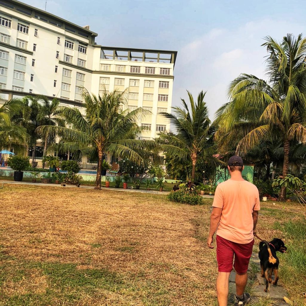 We loaded Kiara and our bags into the large taxi and drove 15 minutes to the hotel. Sai Gon Hotel in Rach Gia (Hotel: https://www.booking.com/hotel/vn/sai-gon-rach-gia.html ). We stayed here before and put Kiara in the basement of their car park after discussing with the front office manager that I didn’t want anyone of the staff to go near her. (30 minutes later we saw one of the security feeding her hot dogs… 🙁 ) We tied her leash to one of the pipes in the basement so that she had about 2 or 3 meter to walk around.